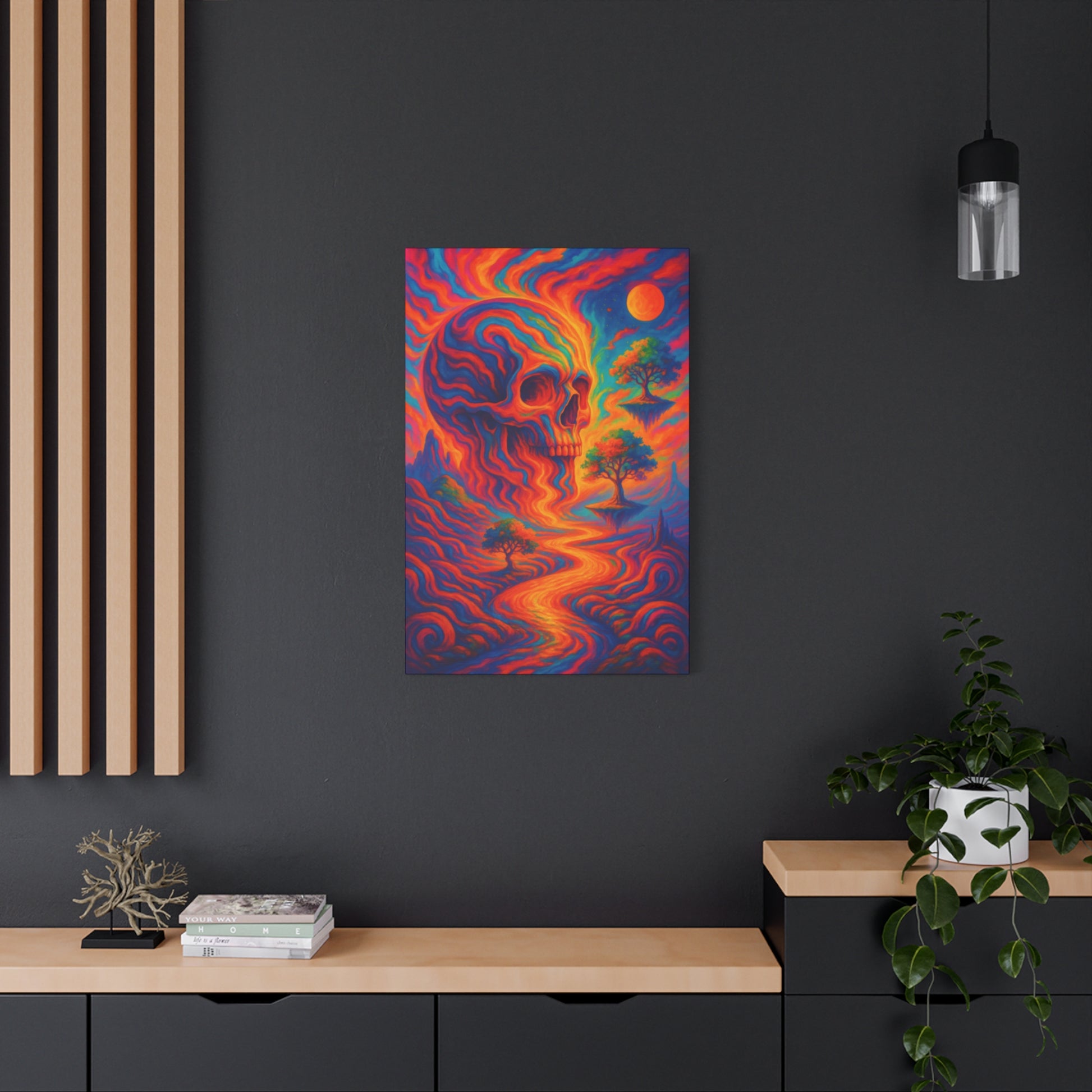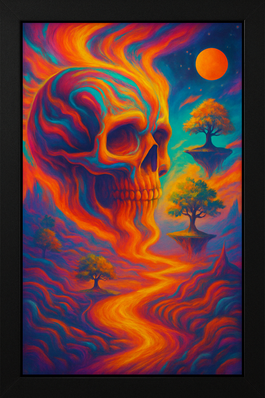 A fiery swirl of thought and decay, Embermind captures the surreal intersection of life, death, and dreamlike beauty. A molten skull forms in the sky, its vibrant tendrils flowing into a river of flame that winds through a glowing landscape. Suspended trees float in the ether, untouched by time. This piece radiates heat, emotion, and an eerie calm—perfect for those drawn to the mysterious edge between reality and imagination.