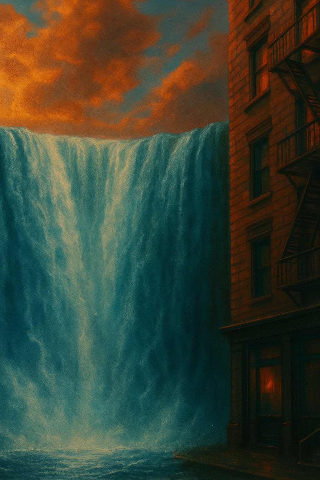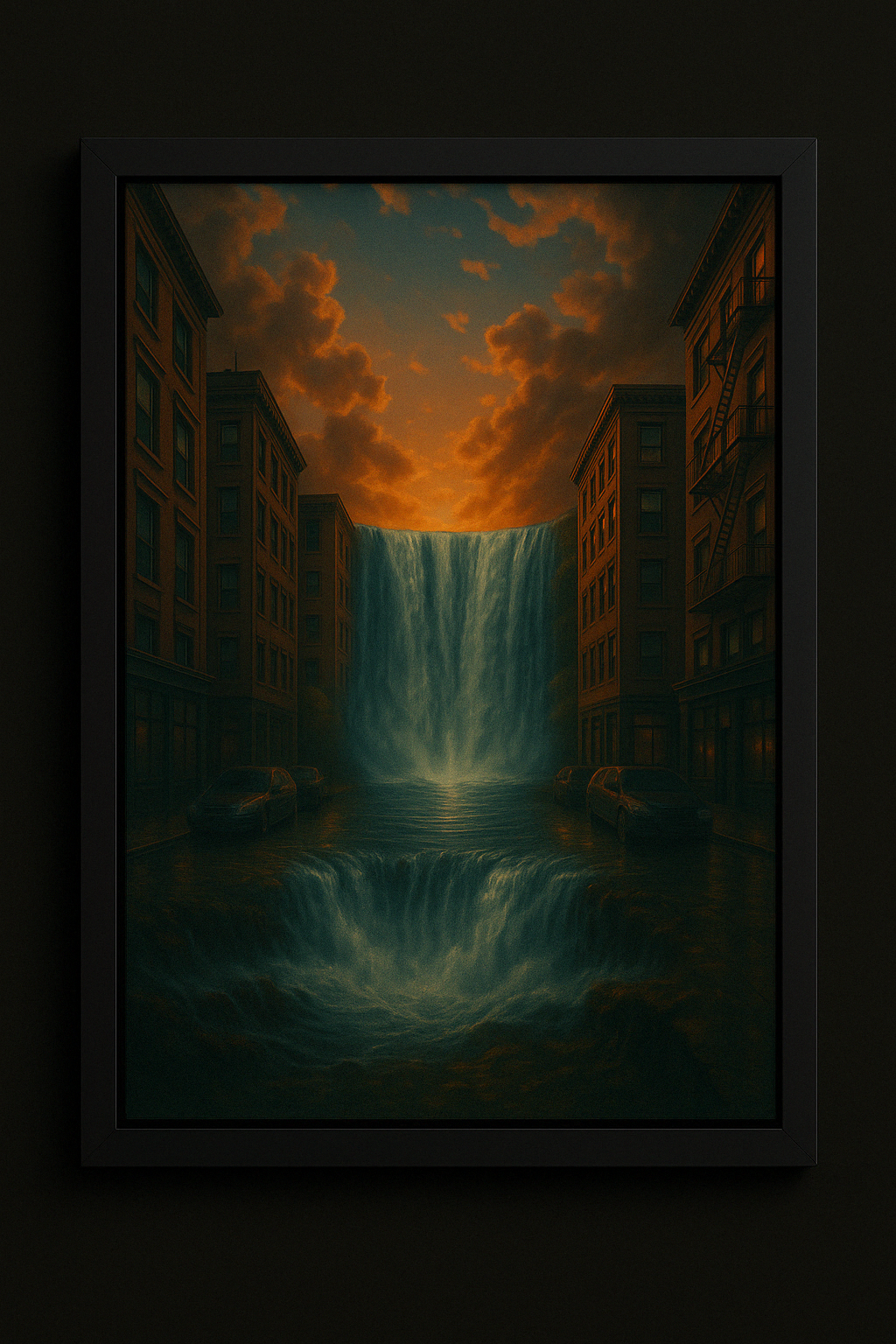 A city frozen in the moment it gave in — when the waterfall swallowed the street and the ground opened wide. Cascade Collapse captures the surreal balance of beauty and chaos, where nature flows through the cracks of human order. Printed on premium canvas and available in multiple sizes. A piece meant to disturb, mesmerize, and pull you in.